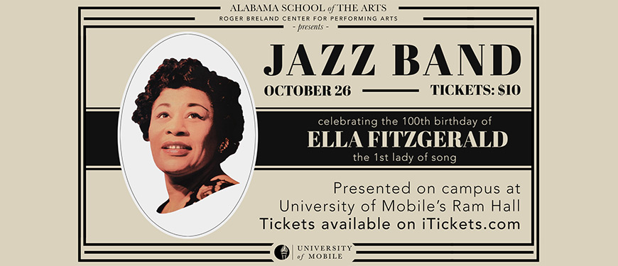 Celebrating the 100th Birthday of the First Lady of Song, our Jazz Band presents an evening of music made popular by the beloved Ella Fitzgerald. This ensemble of thirty instrumentalists from the University’s Alabama School of the Arts and featured soloists is brought to you under the direction of Kenn Hughes, Chair of the Music Department, director of RamCorps, and former music director for the Dove Award-winning group Denver and the Mile High Orchestra.