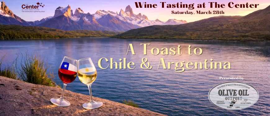 The Center will host its annual wine tasting fundraiser on March 28, featuring wines from Chile and Argentina. Guests will enjoy seven wines paired with cheeses, meats, and gourmet bites, along with a light program, and a guided tasting led by AMI Sommelier MaryKate Scott.